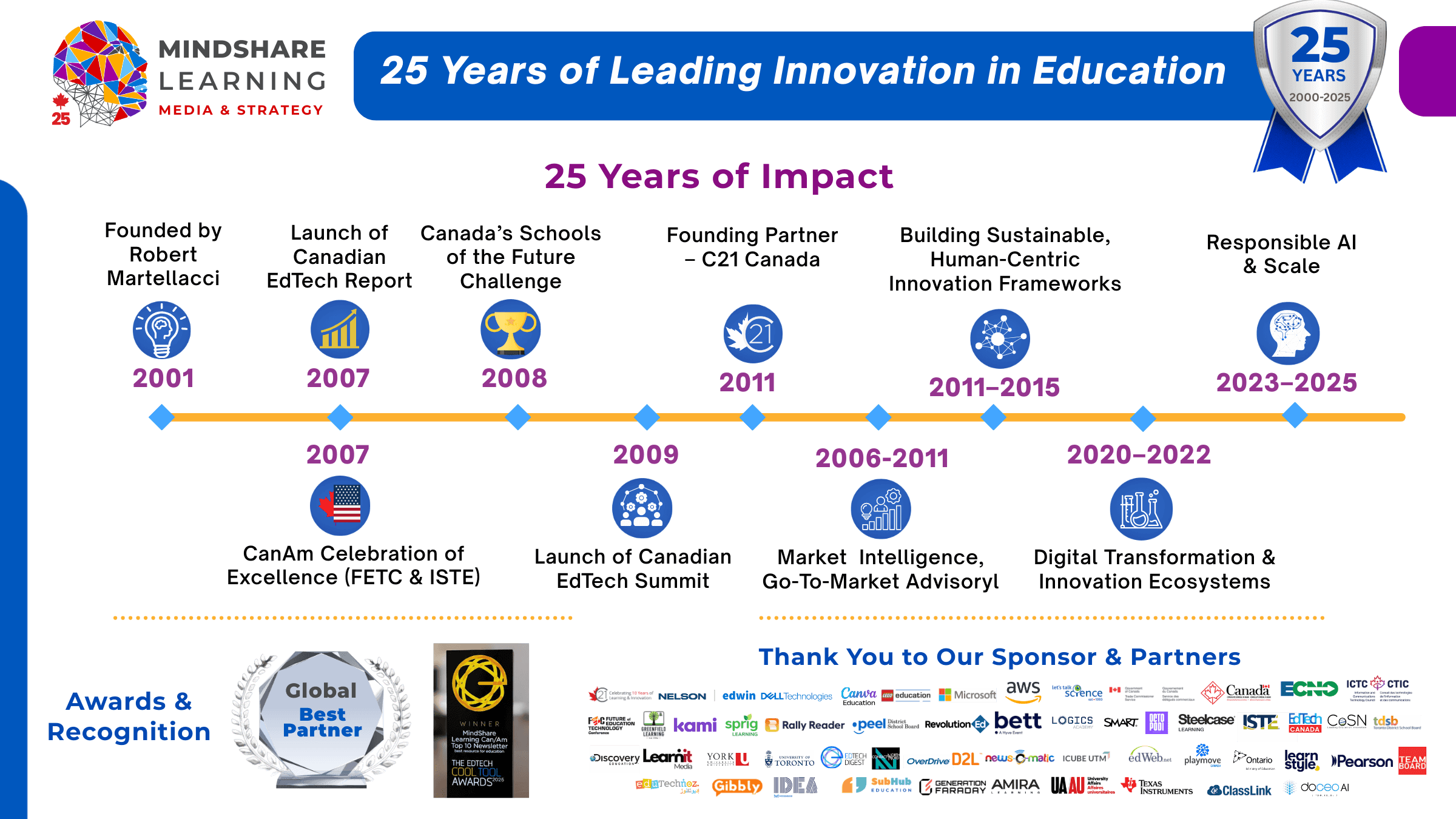 This month, we pause to reflect on 25 years of MindShare Learning Media & Strategy Group, a journey defined by curiosity, connection, and a deep belief that education is the most powerful lever for meaningful change. What began as a conversation about digital learning has evolved into a global dialogue on innovation, leadership, and the human side of transformation across K-12 and post-secondary education.